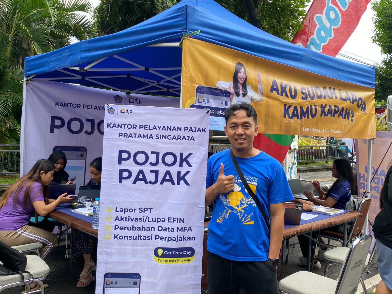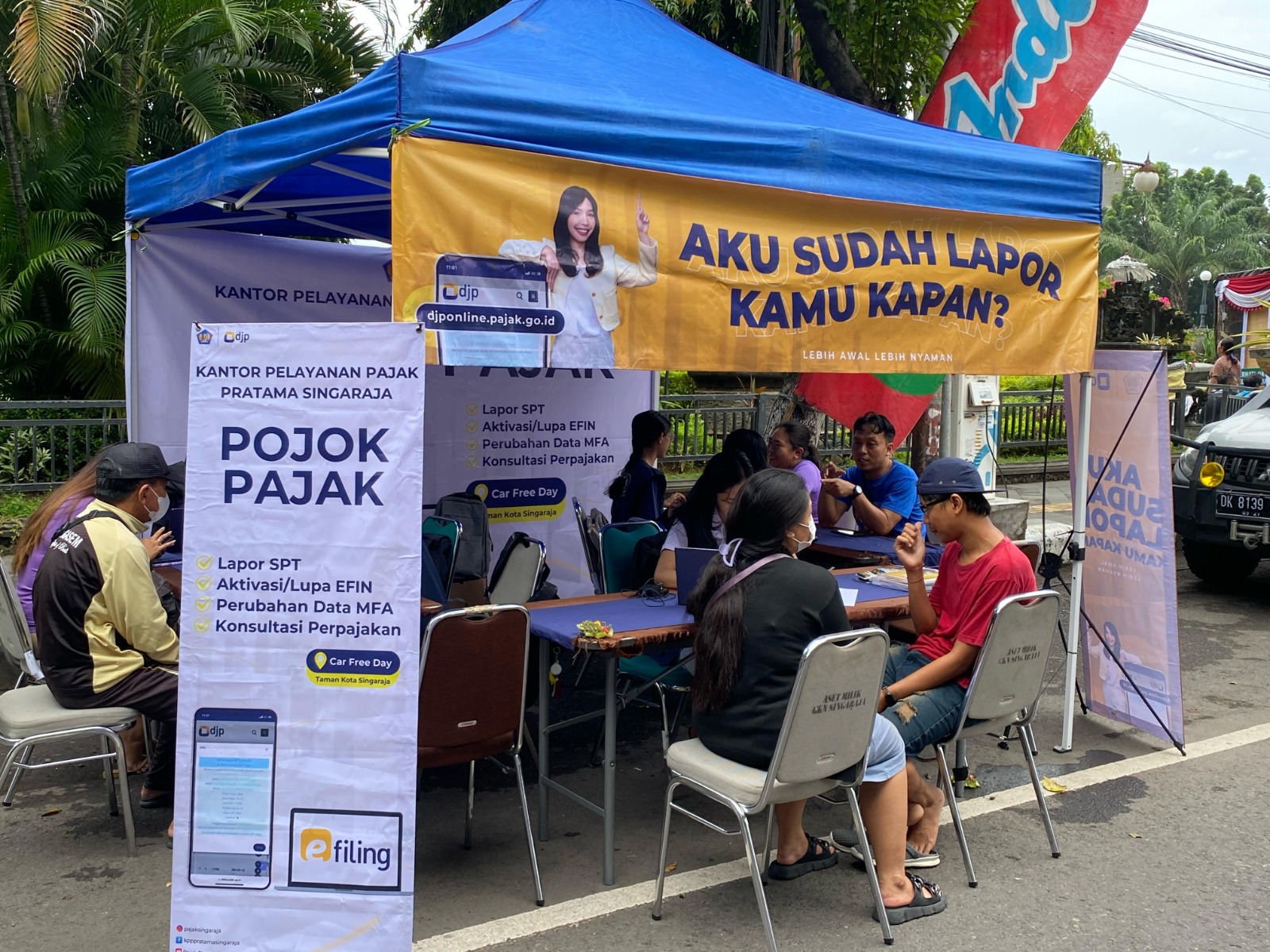 Kantor Pelayanan Pajak (KPP) Pratama Singaraja menyelenggarakan layanan Pojok Pajak di Car Free Day Taman Kota Singaraja (Minggu, 23/3). Layanan Pojok Pajak dimulai pada pukul 06.30 s.d. 09.00 WITA. Layanan ini diberikan oleh pegawai KPP Pratama Singaraja dan Relawan Pajak. Jenis layanan perpajakan yang disediakan yaitu pelaporan Surat Pemberitahuan (SPT) Tahunan, permohonan aktivasi/lupa EFIN, dan konsultasi akun Coretax DJP.
