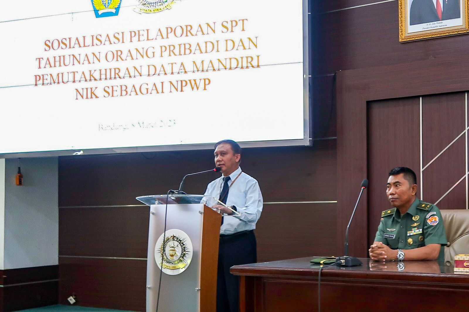 Kantor Pelayanan Pajak (KPP) Pratama Bandung Tegallega menyelenggarakan sosialisasi pemutakhiran data mandiri NIK sebagai NPWP dan pelaporan SPT Tahunan di Sekolah Staf dan Komando Angkatan Darat (SESKOAD), Jalan Gatot Subroto No. 96, Kota Bandung (Rabu, 8/3).