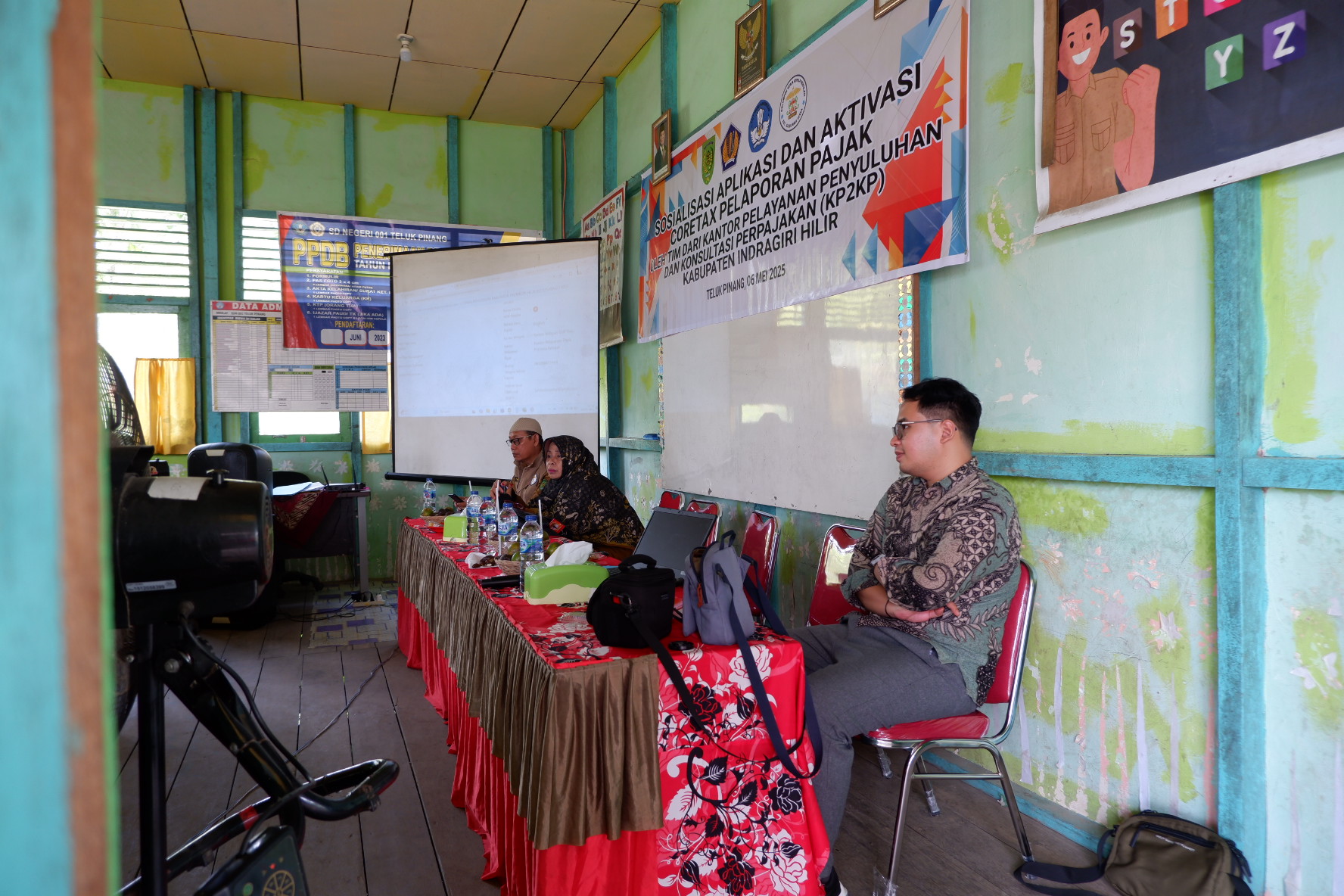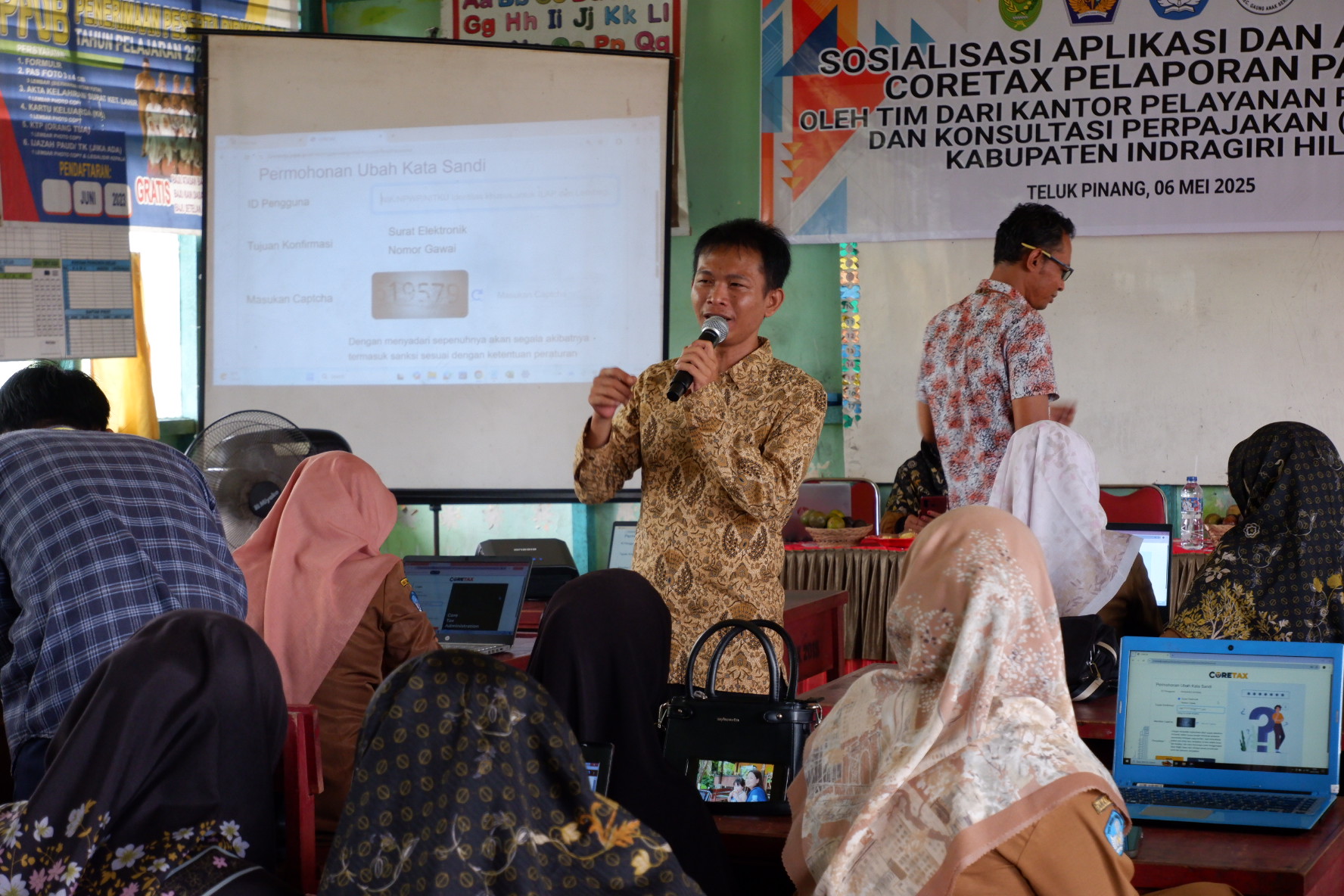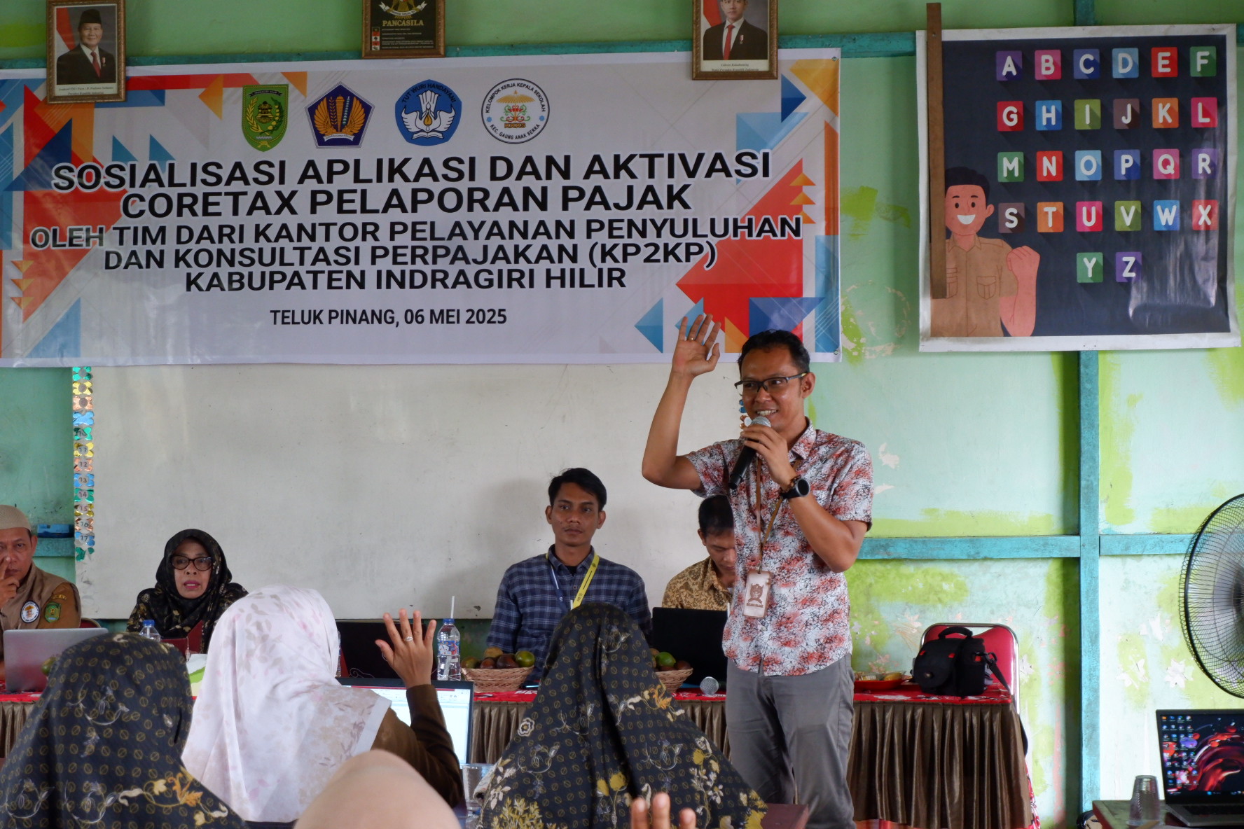 Kantor Pelayanan, Penyuluhan, dan Konsultasi Perpajakan (KP2KP) Tembilahan menyelenggarakan sosialisasi bertajuk "Sosialisasi Aplikasi dan Aktivasi Coretax" di SD Negeri 001 Teluk Pinang, Kecamatan Gaung Anak Serka, Kabupaten Indragiri Hilir (Selasa, 6/5).