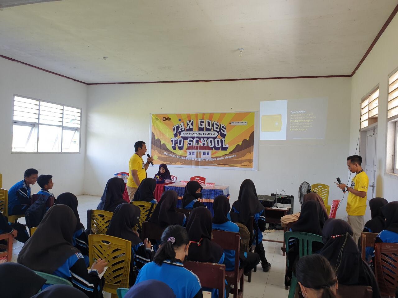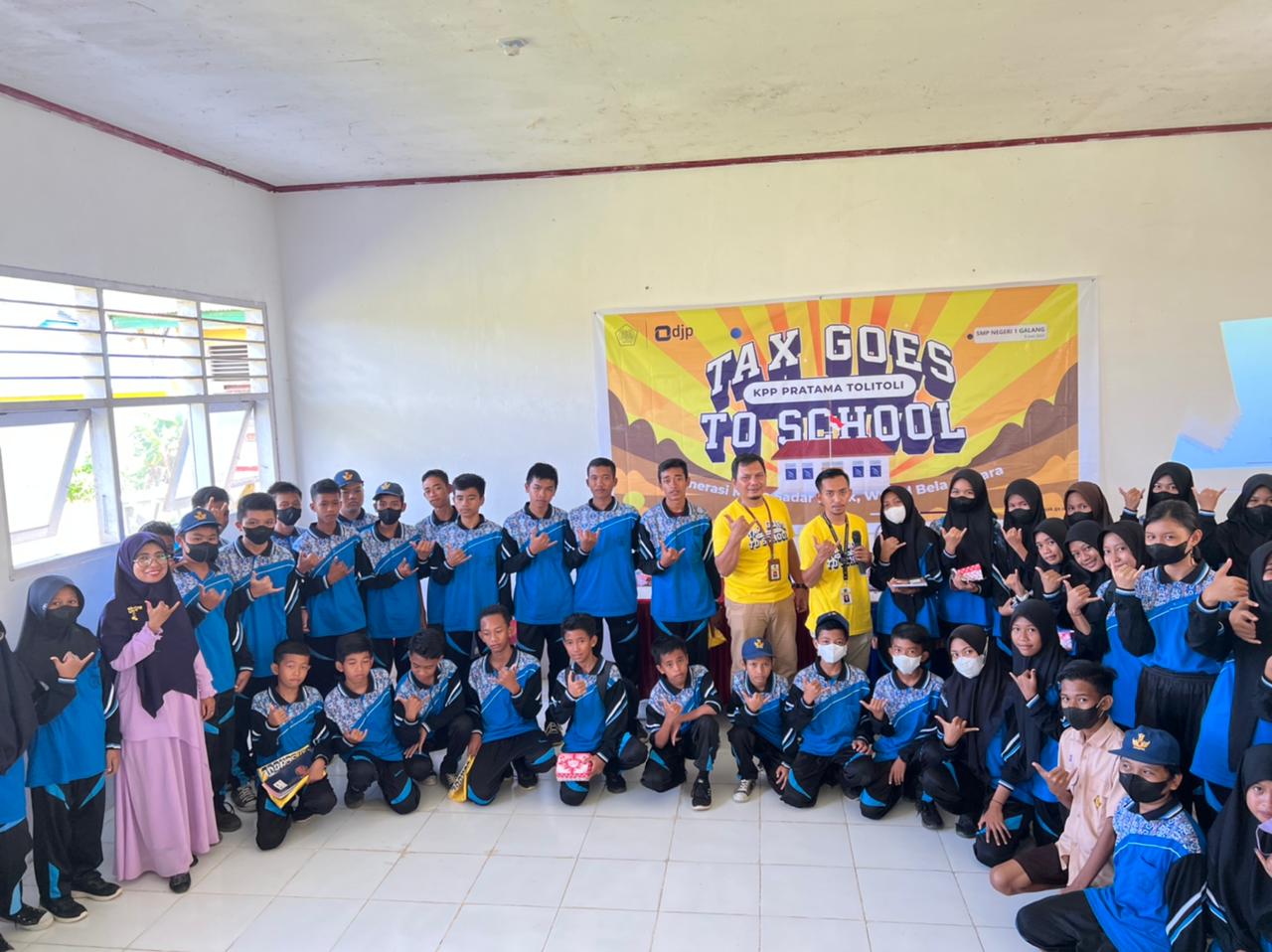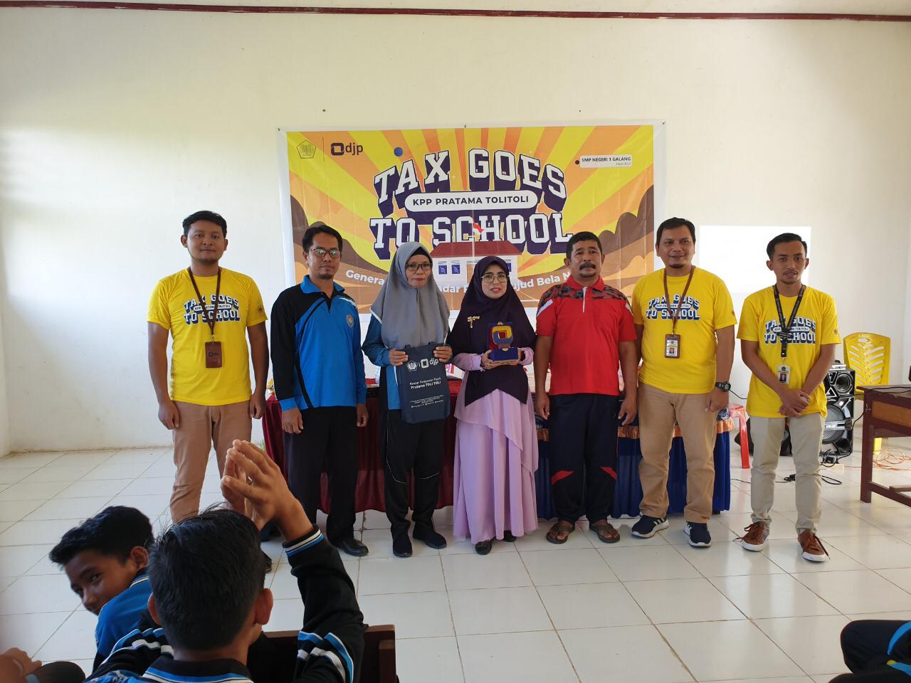 Kantor Pelayanan Pajak (KPP) Pratama Tolitoli menyelenggarakan kegiatan Tax Goes to School (TGTS) secara langsung atau luar jaringan (luring) di SMP Negeri 1 Galang Kabupaten Tolitoli (Jum’at, 3/6). Kegiatan kali ini mengambil tema "Generasi Muda Sadar Pajak, Wujud Bela Negara".