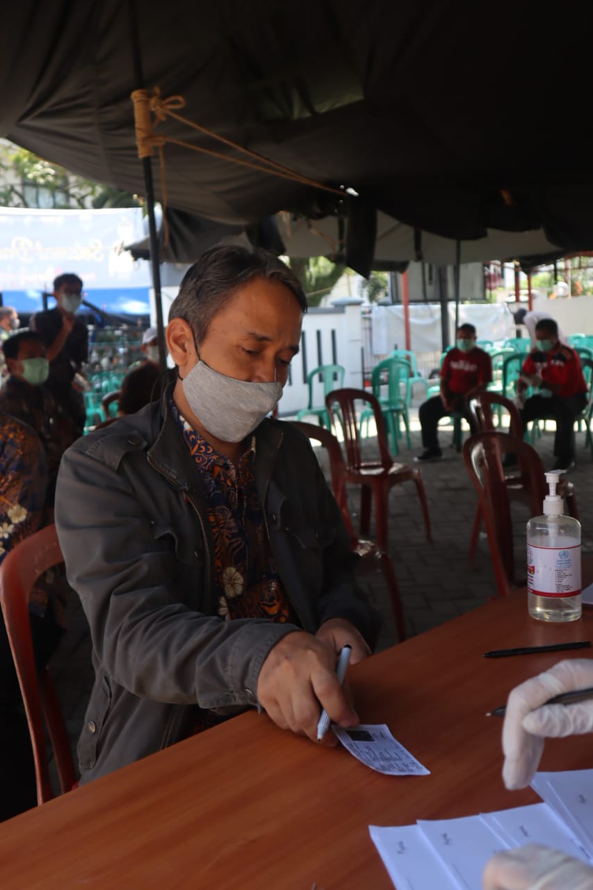 Sebelum menerima vaksinasi, para pegawai terlebih dahulu melakukan pendaftaran dengan menyerahkan data diri berupa Kartu Tanda Penduduk (KTP) dan dilanjutkan dengan observasi kesehatan. Kemudian para pegawai menunggu giliran untuk mendapatkan dosis kedua vaksinasi Covid-19.