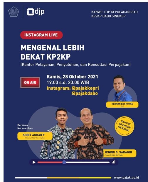 Kantor Pelayanan, Penyuluhan, dan Konsultasi Perpajakan (KP2KP) Dabo Singkep bersinergi dengan Tim Penyuluh Pajak Kantor Wilayah Direktorat Jenderal Pajak Kepulauan Riau (Kanwil DJP Kepri) mengadakan gelar wicara melalui Instagram live @pajakdabo dan @pajakkepri dengan tema “Mengenal Lebih Dekat Kantor Pelayanan, Penyuluhan dan Konsultasi Perpajakan (KP2KP)” di Singkep, Lingga, Kepulauan Riau (Kamis, 28/10).