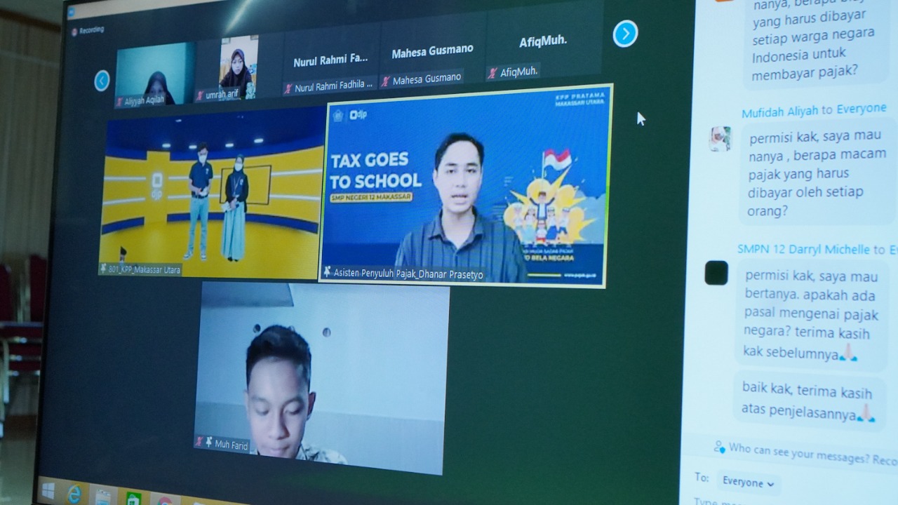 Kantor Pelayanan Pajak (KPP) Pratama Makassar Utara menyelenggarakan kegiatan Tax Goes to School (TGTS) dengan menggandeng pelajar dari SMP Negeri 12 Makassar (Kamis, 11/11). TGTS kali ini dilangsungkan secara daring melalui Zoom Meeting dari ruang studio KPP Pratama Makassar Utara, Kota Makassar.