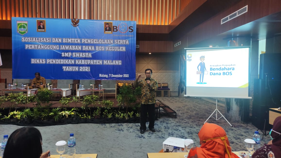 Penyuluh Kantor Pelayanan Pajak (KPP) Pratama Kepanjen menjadi narasumber dalam acara Sosialisasi dan Bimbingan Teknis (bimtek) Pengelolaan serta Pertanggungjawaban Dana Bantuan Operasional Sekolah Reguler Sekolah Menengah Pertama (SMP) Swasta Tahun 2021 yang bertempat di Rayz UMM Hotel, Kabupaten Malang (Selasa, 7/12).