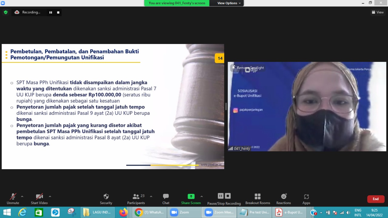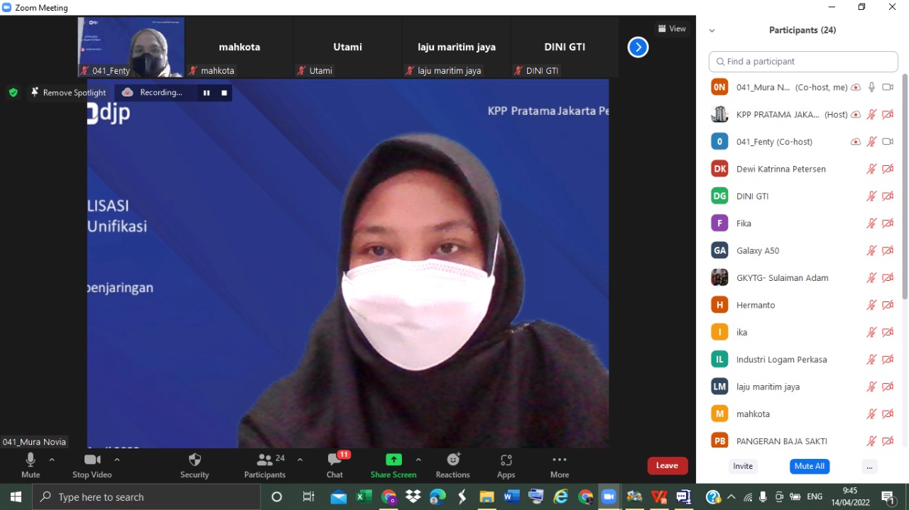 Penyuluh Kantor Pelayanan Pajak (KPP) Pratama Jakarta Penjaringan melaksanakan sosialisasi tentang Surat Pemberitahuan (SPT) Unifikasi di Jakarta (Kamis, 14/4). Sosialisasi yang dilaksanakan secara daring ini diikuti 24 wajib pajak.