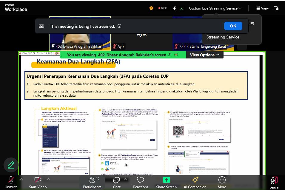 Dalam sesi awal, Andi sebagai narasumber menyampaikan panduan langkah demi langkah untuk melakukan aktivasi akun Coretax DJP, mulai dari login pertama kali hingga pengelolaan profil wajib pajak. Sementara itu, Dheaz melanjutkan dengan penjelasan mengenai cara pelaporan SPT tahunan melalui sistem Coretax DJP, disertai demonstrasi langsung di layar agar peserta lebih mudah memahami alur pelaporan.
