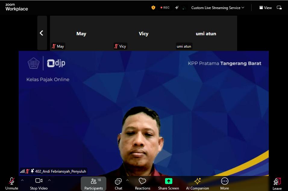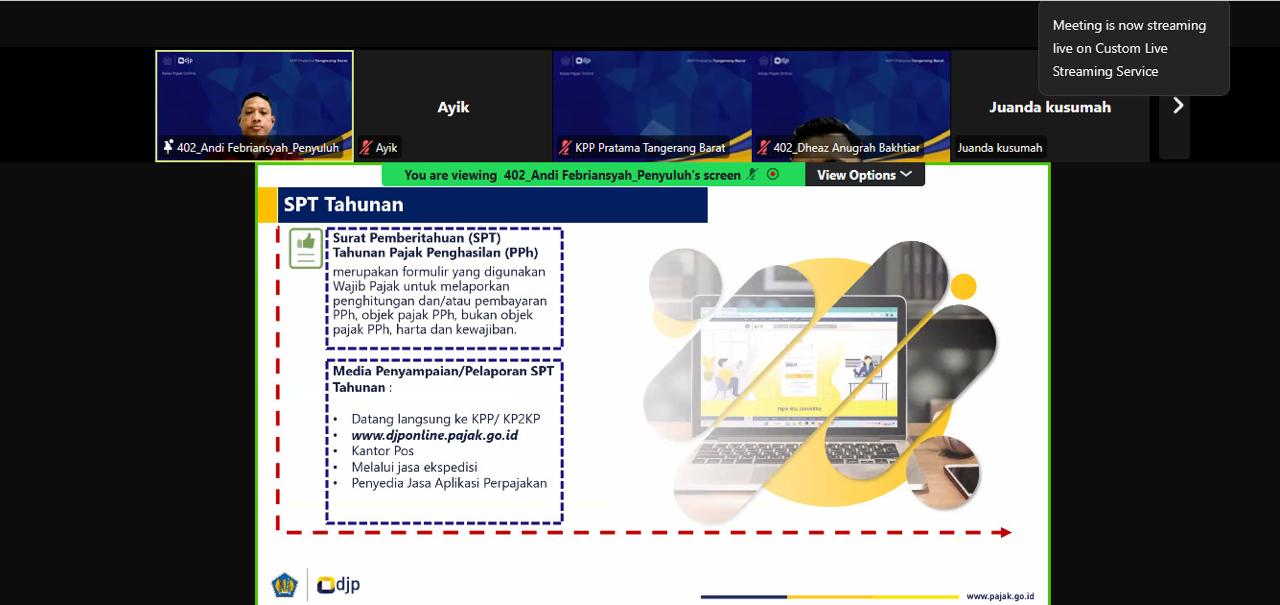 Kantor Pelayanan Pajak (KPP) Pratama Tangerang Barat kembali menggelar kegiatan kelas pajak secara daring melalui aplikasi Zoom Meetings bertempat di KPP Pratama Tangerang Barat, Jalan Imam Bonjol Nomor 47, RT 002 RW 004, Sukajadi, Karawaci, Kota Tangerang, Banten (Selasa, 7/10).