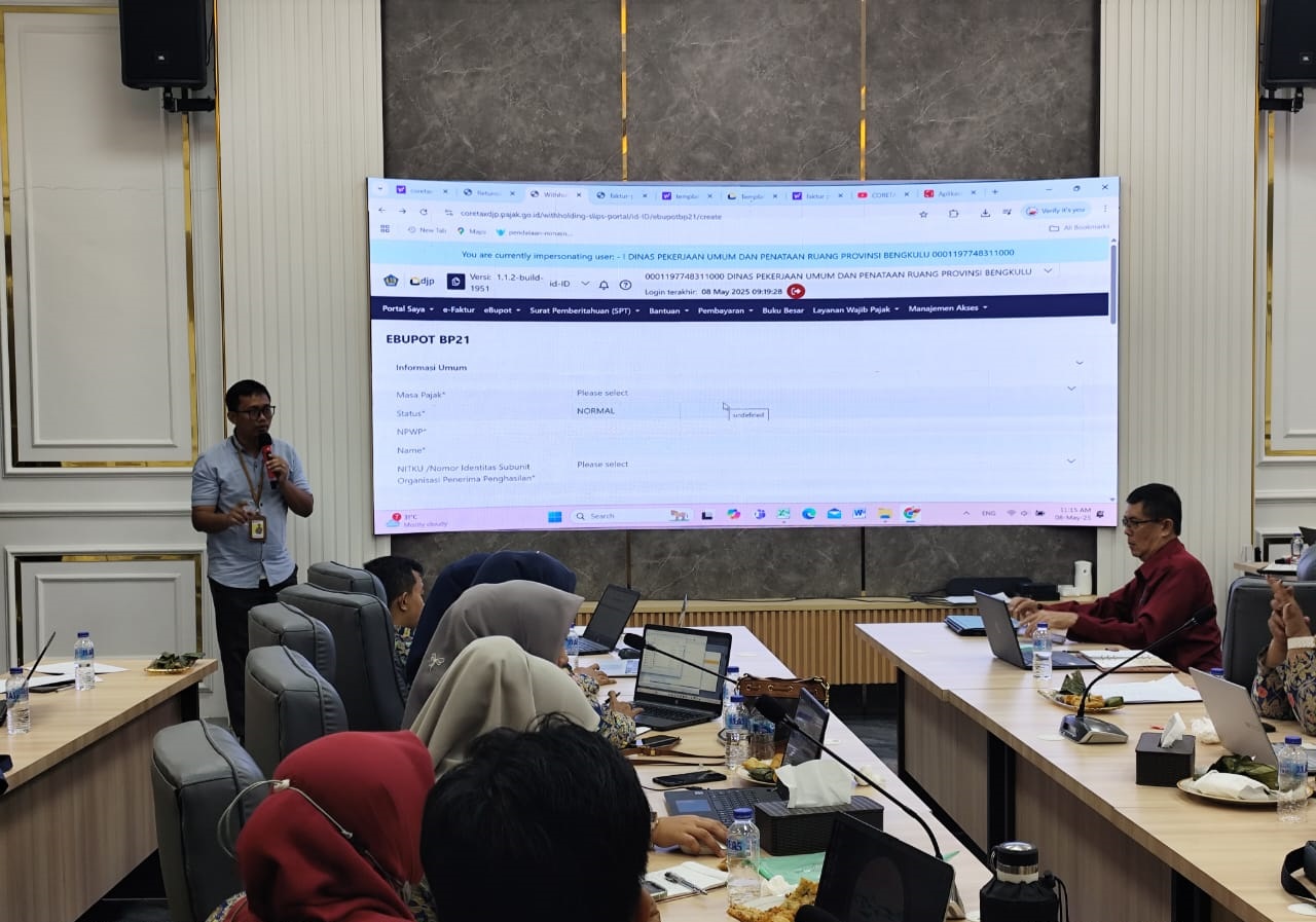 Kantor Pelayanan Pajak (KPP) Pratama Bengkulu Satu menggelar sosialisasi dan pelatihan Coretax dalam upaya meningkatkan efektivitas sistem pemerintahan daerah di Kantor Dinas Pekerjaan Umum dan Penataan Ruang (PUPR) Provinsi Bengkulu, Kota Bengkulu (Kamis, 8/5).