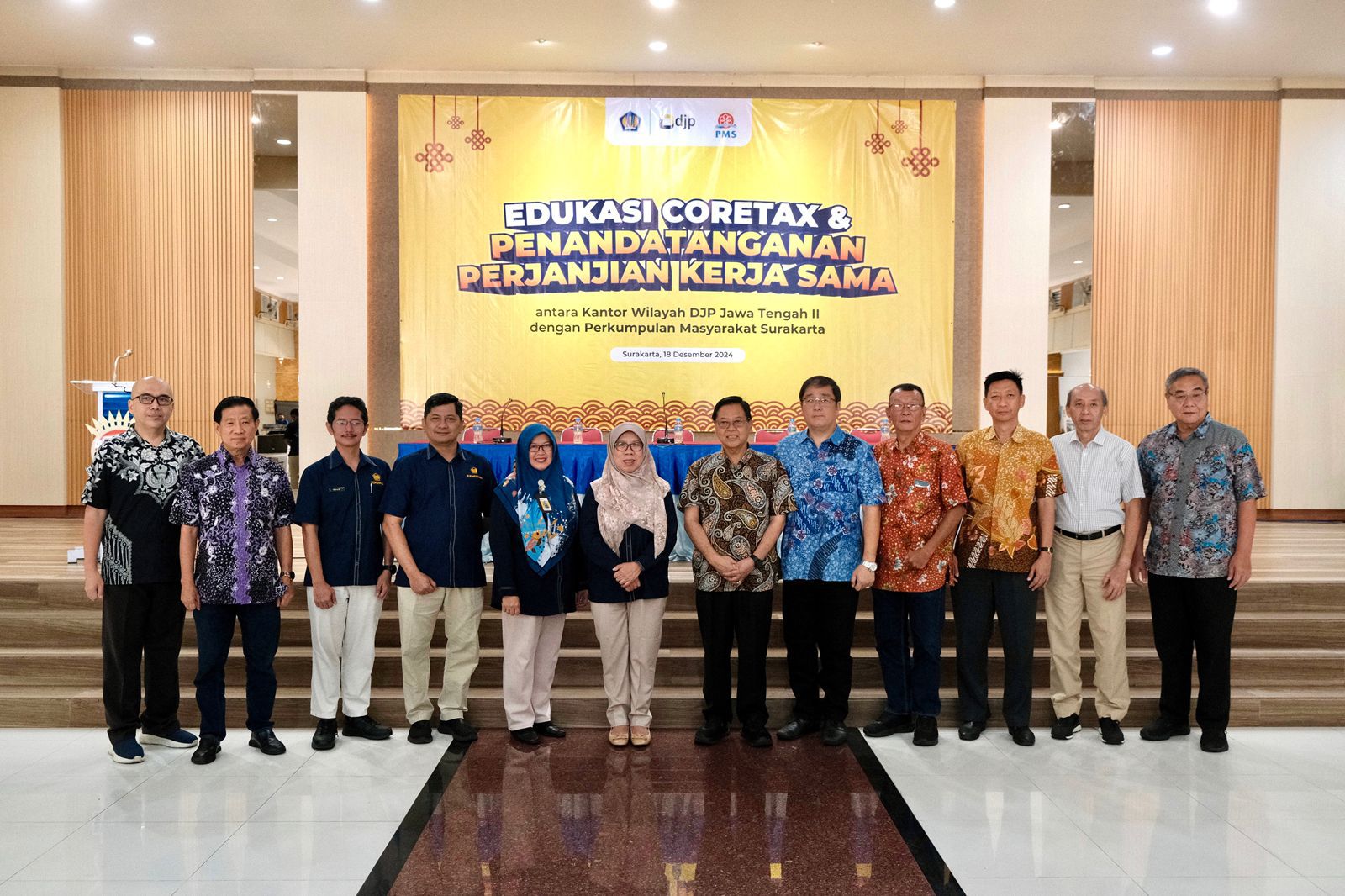 Kantor Wilayah Direktorat Jenderal Pajak (Kanwil DJP) Jawa Tengah II kembali memperpanjang kerja sama dengan Perkumpulan Masyarakat Surakarta (PMS) melalui penandatanganan perjanjian kerja sama dan edukasi Coretax yang berlangsung di Gedung Pertemuan PMS Surakarta, Kota Surakarta (Rabu, 18/12). Acara ini dihadiri sekitar 200 pengusaha dan masyarakat Surakarta.