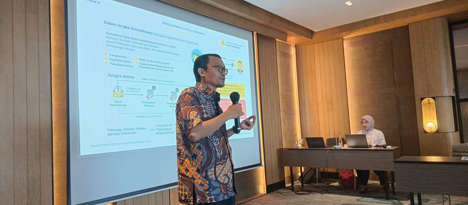 "PMK Nomor 15 Tahun 2025 merupakan turunan langsung dari amanat Undang-Undang KUP dan menjadi dasar teknis dalam meningkatkan efektivitas serta transparansi pemeriksaan," terang Reza Kurniawan saat menyampaikan materi. Ia juga menambahkan bahwa, “Perkembangan sistem Coretax (DJP –red) mendorong reformasi proses bisnis agar lebih modern dan akuntabel.”