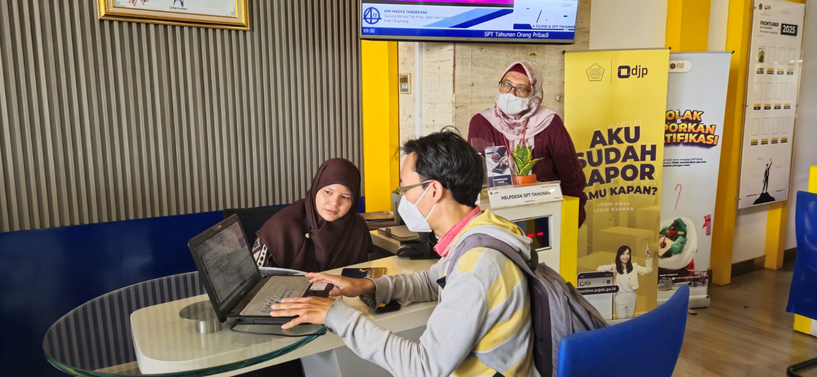 "Selamat pagi, Bu. Saya mau lapor SPT pakai e-Form," ucap wajib pajak sambil meletakkan laptop miliknya di meja loket.