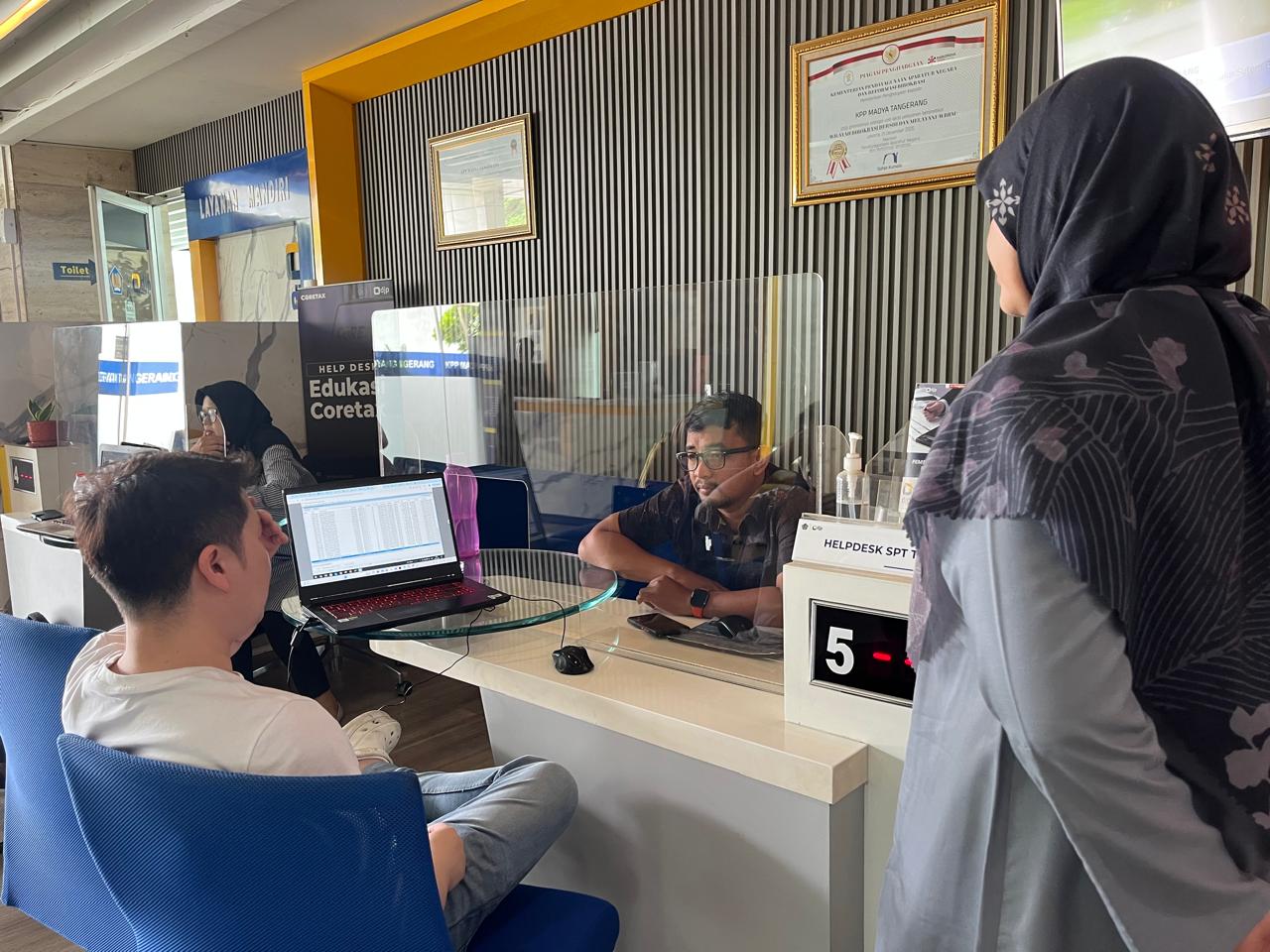 Tosa, Petugas Helpdesk Kantor Pelayanan Pajak (KPP) Madya Tangerang, memberikan konsultasi kepada seorang karyawan Wajib Pajak Badan Usaha di Loket Helpdesk KPP Madya Tangerang, Gedung Menara Top Food, Jalan Jalur Sutera Barat No. 3, Panunggangan Timur, Pinang, Kota Tangerang, Banten (Kamis,30/1).