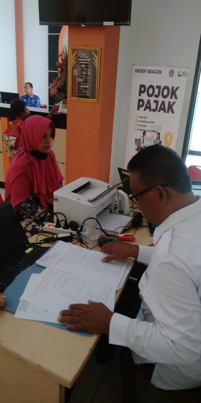 Kantor Pelayanan, Penyuluhan, dan Konsultasi Perpajakan (KP2KP) Sragen menyelenggarakan pojok pajak di Kantor Kecamatan Gemolong, Kab. Sragen (Senin, 17/4). Kegiatan pojok pajak melayani laporan Surat Pemberitahuan (SPT) Tahunan, validasi Nomor Induk Kependudukan (NIK)-Nomor Pokok Wajib Pajak (NPWP), aktivasi EFIN, permintaan kembali EFIN, pembuatan kode billing, dan konsultasi perpajakan.