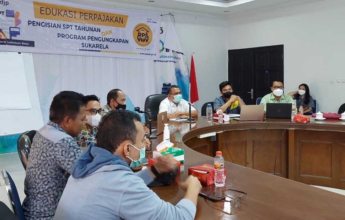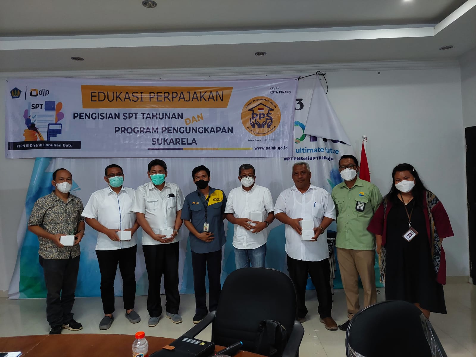 Kantor Pelayanan Penyuluhan dan Konsultasi Perpajakan (KP2KP) Kota Pinang menyelenggarakan kegiatan asistensi pelaporan Surat Pemberitahuan (SPT) Tahunan Pajak Penghasilan (PPh) Wajib Pajak Orang Pribadi dan Sosialisasi Program Pengungkapan Sukarela di PT. Perkebunan Nusantara Labuhan Batu-1 Kabupaten Labuhanbatu Selatan (Kamis,10/3). Kegiatan ini dihadiri 7 Manager Kebun dan 21 pegawai yang mengurus bagian keuangan dan pajak.