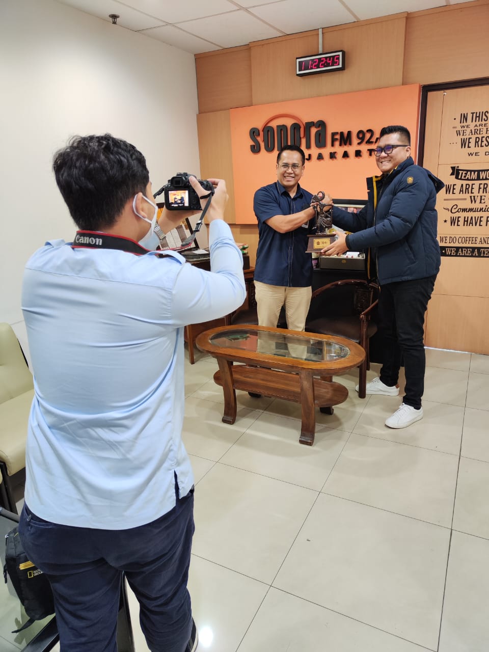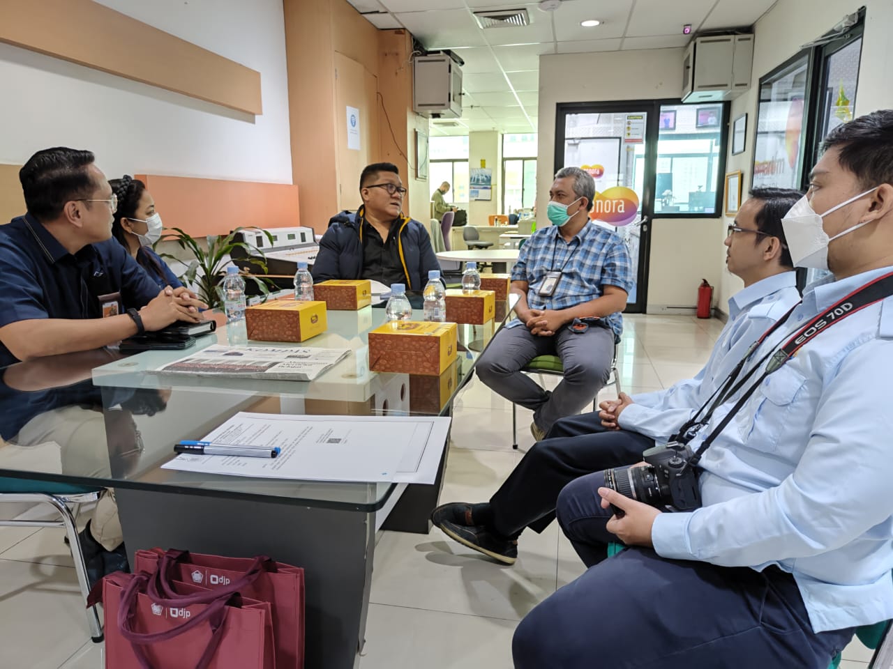 Tim Humas Kantor Wilayah (Kanwil) Direktorat Jenderal Pajak (DJP) Jakarta Barat mengunjungi Studio Radio Sonora di Gedung Kompas Gramedia Lantai 5, Taman Sari, Jakarta Barat (Kamis, 4/5).