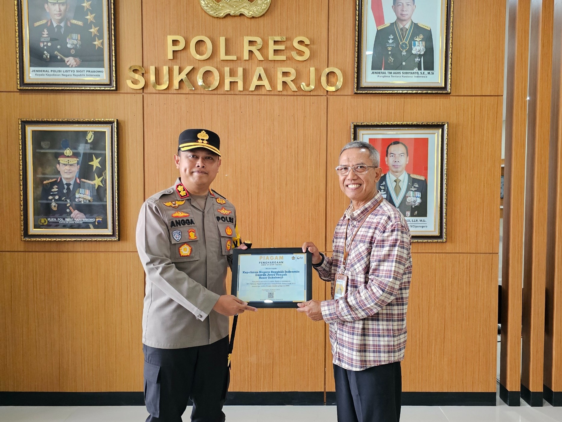 Kantor Pelayanan Pajak (KPP) Pratama Sukoharjo menyerahkan piagam penghargaan kepada Kepolisian Resor (Polres) Sukoharjo atas pencapaian pelaporan Surat Pemberitahuan (SPT) Tahunan 100% di Polres Sukoharjo, Kabupaten Sukoharjo (Kamis, 27/3). Kepala KPP Pratama Sukoharjo, Yoephida Laksmijarta Soemantri, menyerahkan langsung penghargaan tersebut kepada Kapolres Sukoharjo, AKBP Anggaito Hadi Prabowo, S.H., S.I.K.