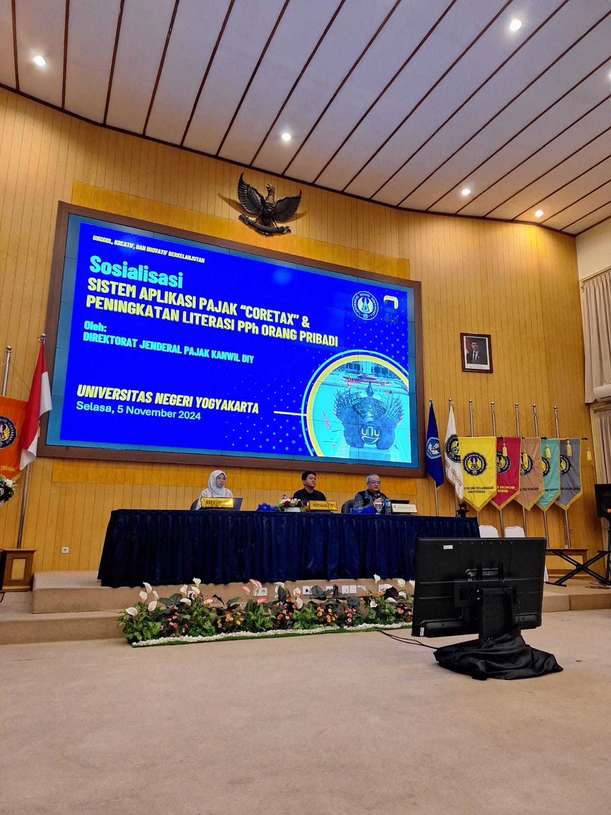 Sebanyak 300 Civitas Akademica Universitas Negeri Yogyakarta (UNY) mengikuti kegiatan edukasi perpajakan hasil kolaborasi antara Kantor Wilayah Direktorat Jenderal Pajak Daerah Istimewa Yogyakarta (Kanwil DJP DIY) dengan UNY di Ruang Auditorium UNY, Kab. Sleman (Selasa, 5/11). Kegiatan ini dilaksanakan guna menambah literasi terkait Coretax serta Pajak Penghasilan (PPh) Pasal 21 menggunakan Tarif Efektif Rata-Rata (TER).