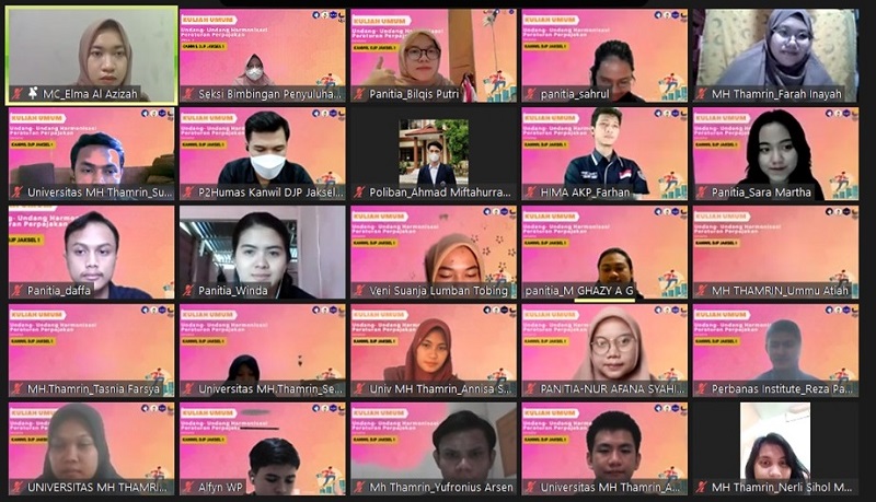 Fungsional Penyuluh Kantor Wilayah DJP Jakarta Selatan I menjadi narasumber pada Kuliah Umum Perpajakan yang dilaksanakan secara daring oleh Universitas MH. Thamrin di Jakarta (13/1). Kegiatan yang bertujuan untuk meningkatkan pengetahuan Mahasiswa Akuntansi Perpajakan serta meningkatkan kesadaran pajak bagi Mahasiswa Perguruan Tinggi ini diikuti oleh 231 mahasiswa dari universitas MH Thamrin dan terbuka untuk mahasiswa umum.