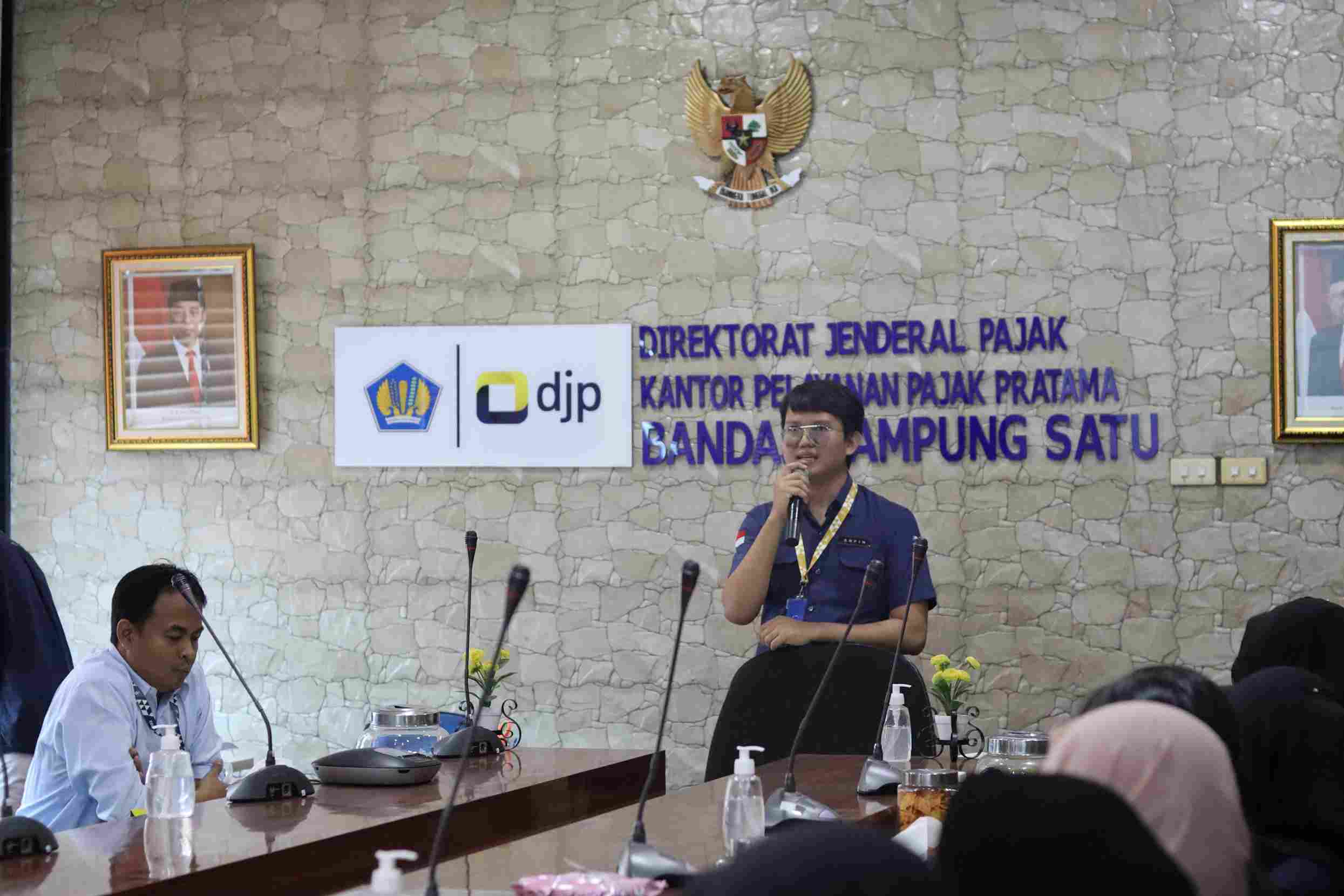 Kantor Pelayanan Pajak (KPP) Pratama Bandar Lampung Satu menyambut kedatangan relawan pajak dalam kegiatan Pengukuhan dan Pembekalan Relawan Pajak di Ruang Rapat KPP Pratama Bandar Lampung Satu (Rabu, 15/2). Kegiatan ini dihadiri oleh mahasiswa/i yang berasal dari Institut Informatika dan Bisnis Darmajaya, Universitas Lampung, dan Universitas Mitra Indonesia.