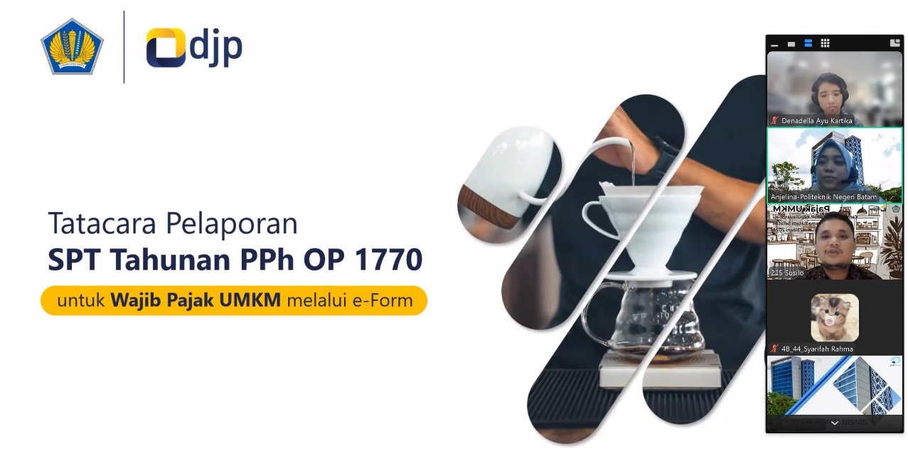 Kantor Pelayanan Pajak (KPP) Pratama Batam Selatan menyelenggarakan Business Development Services (BDS) kepada Relawan Pajak dari Tax Center Politeknik Negeri Batam (Polibatam) secara daring di Kota Batam, Kepulauan Riau (Jumat, 28/6). BDS kali ini memberi edukasi tentang tata cara pelaporan Surat Pemberitahuan (SPT) Tahunan Pajak Penghasilan (PPh) Orang Pribadi 1770 untuk Wajib Pajak UMKM.