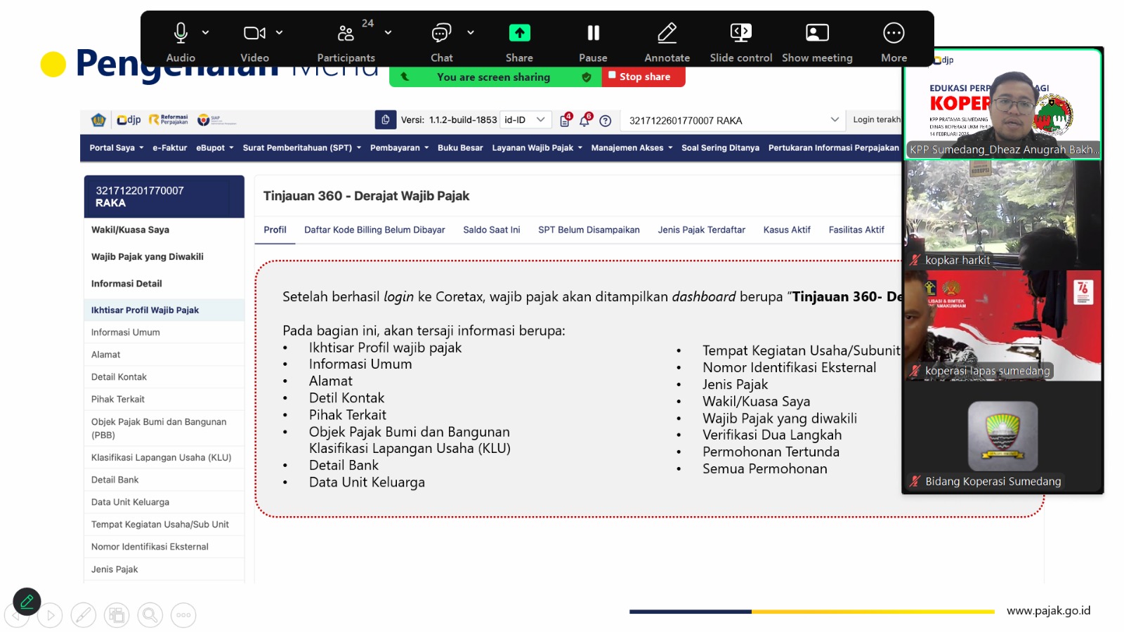 Kantor Pelayanan Pajak (KPP) Pratama Sumedang memberikan edukasi kepada 22 koperasi secara daring melalui aplikasi Zoom Meeting di Kabupaten Sumedang (Jumat, 14/2).