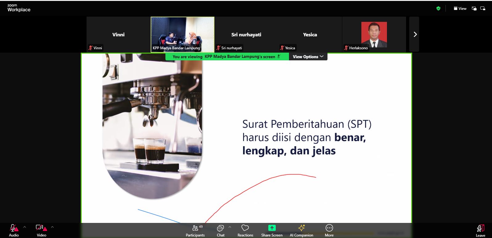 Kantor Pelayanan Pajak (KPP) Madya Bandar Lampung menyelenggarakan kelas pajak online melalui Aplikasi Zoom Meetings untuk memberikan asistensi pelaporan Surat Pemberitahuan (SPT) Tahunan bagi Wajib Pajak Orang Pribadi UMKM (Jumat,14/3).