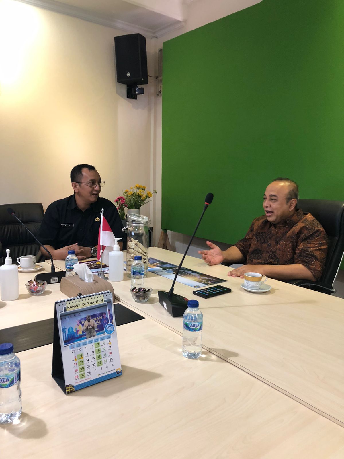 Kepala Kantor Wilayah Direktorat Jenderal Pajak (Kanwil DJP) Banten Yoyok Satiotomo menerima kunjungan kerja dari Dinas Penanaman Modal dan Pelayanan Terpadu Satu Pintu (DPMPTSP) Kabupaten Tangerang berdiskusi tentang langkah awal pendirian Mal Pelayanan Publik (MPP) Kabupaten Tangerang di Ruang Rapat Kepala Kanwil DJP Banten, Kota Serang (Jumat, 24/2).