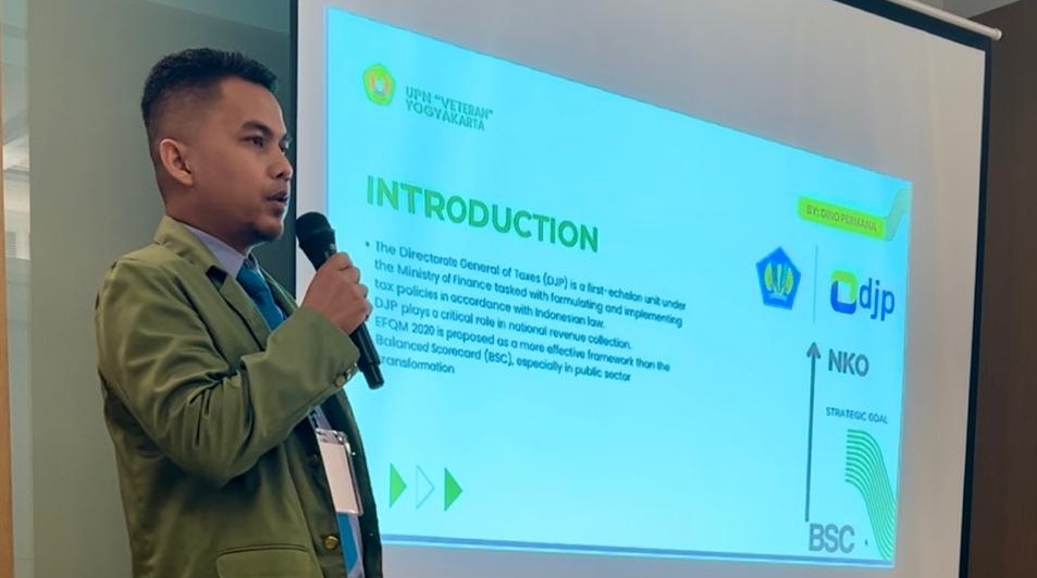 Dino Permana dalam mempresentasikan hasil penelitian berjudul “EFQM 2020 Model is The Future Framework For The Directorate General Of Taxes in Indonesia.” Ia menyoroti pentingnya EFQM 2020 Model sebagai kerangka kerja reformasi birokrasi, khususnya di Direktorat Jenderal Pajak (DJP).