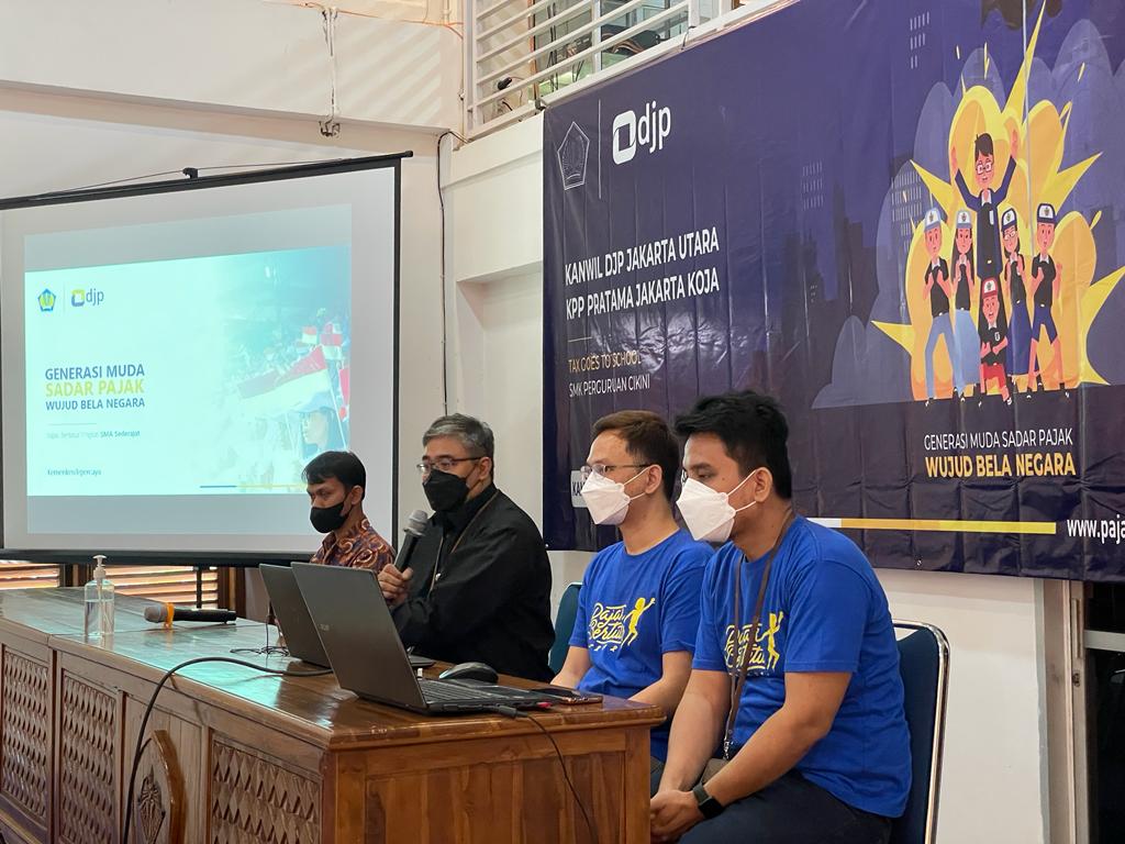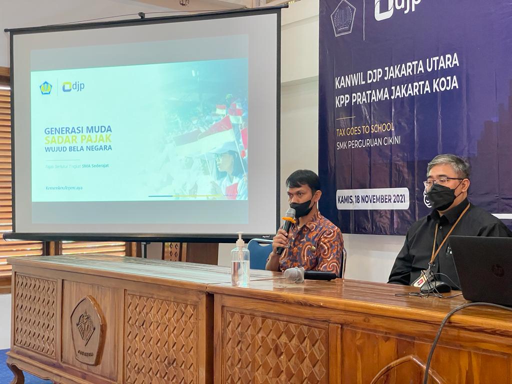 Penyuluh Pajak Kantor Pelayanan Pajak (KPP) Pratama Jakarta Koja bersama Kantor Wilayah (Kanwil) Direktorat Jenderal Pajak (DJP) Jakarta Utara mengunjungi SMK Perguruan Cikini Jakarta Jl. Alur Laut, Rawabadak Utara, Koja (Kamis, 18/11).