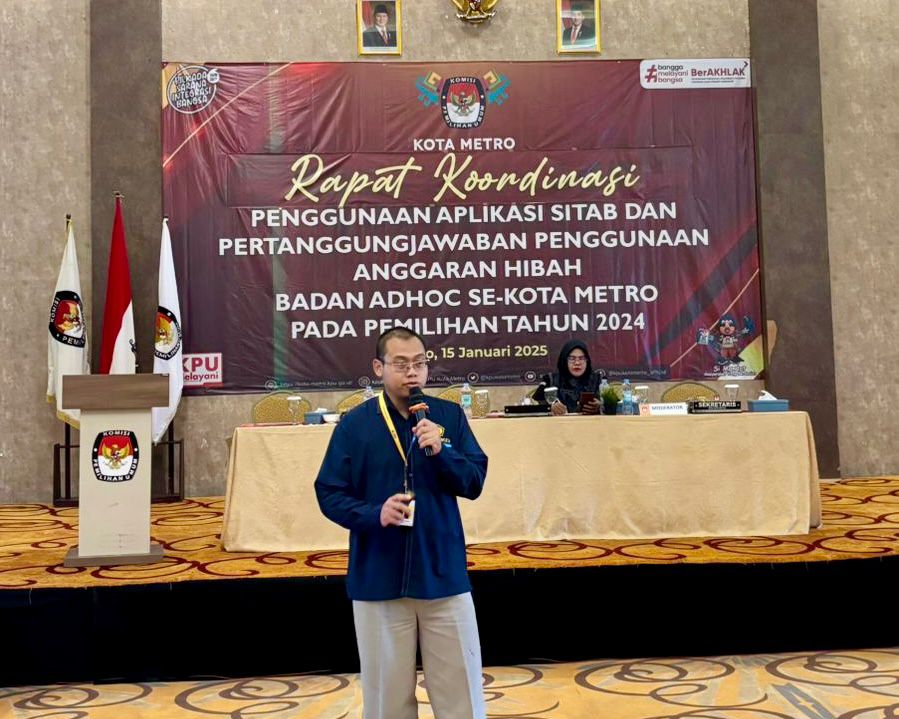 Kantor Pelayanan Pajak (KPP) Pratama Metro memenuhi undangan dari Komisi Pemilihan Umum (KPU) Kota Metro untuk memberikan sosialisasi Aspek Perpajakan atas Dana Hibah Badan Adhoc KPU dalam acara Rapat Koordinasi Pertanggungjawaban Penggunaan Anggaran Hibah Badan Adhoc se-Kota Metro yang bertempat di Aidia Grande Hotel, Jalan A. R. Prawiranegara Nomor 99A, Kota Metro (Rabu, 15/1).