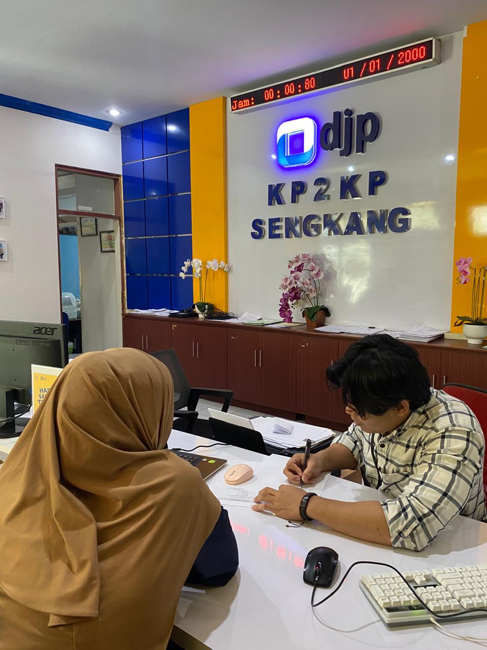 Wajib Pajak Badan mengajukan Surat Keterangan Fiskal (SKF) pada Kantor Pelayanan, Penyuluhan, dan Konsultasi Perpajakan (KP2KP) Sengkang secara langsung di Kantor KP2KP Sengkang, Jalan Nusa Indah, Kabupaten Wajo, Sulawesi Selatan (Kamis, 21/8). Surat ini diajukan untuk keperluan izin usaha travel umroh.