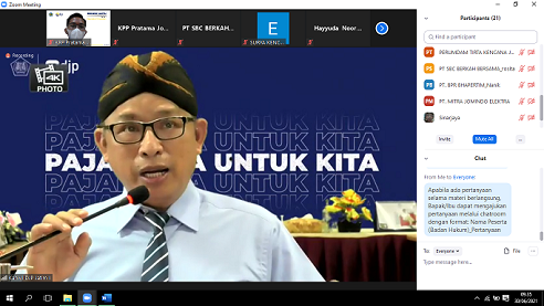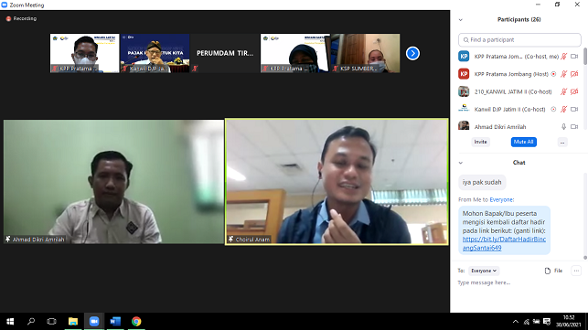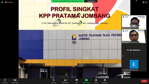 Kantor Pelayanan Pajak (KPP) Pratama Jombang bekerja sama dengan Kantor Wilayah DJP Jawa Timur II (Kanwil DJP Jatim II) melaksanakan diskusi perpajakan secara daring melalui Zoom Meeting di Jombang (Rabu, 30/6). Kegiatan ini dihadiri oleh wajib pajak strategis yang terdaftar di KPP Pratama Jombang.
