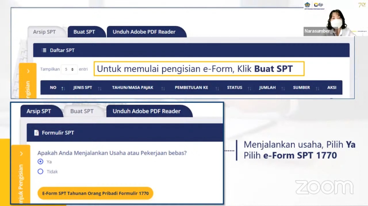 Christy melanjutkan dengan mempraktikkan cara pelaporan SPT Tahunan Orang Pribadi Formulir 1770 untuk non karyawan menggunakan e-Form PDF. “Pelaporan SPT Tahunan tahun pajak 2021 wajib menggunakan e-Form PDF, sudah tidak bisa lagi menggunakan e-SPT ya Bapak/Ibu,” jelas Christy. Setelah praktek cara lapor SPT Tahunan, dilanjutkan dengan sesi tanya jawab dengan wajib pajak yang mengikuti kelas pajak daring. “Wajib pajak dapat menonton ulang siaran kelas pajak ini dan kelas pajak lainnya di Youtube pajakpontibarat,” tutup Christy.