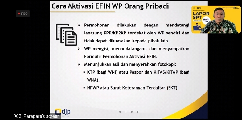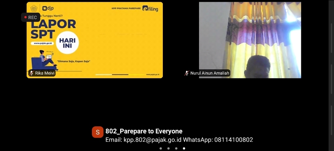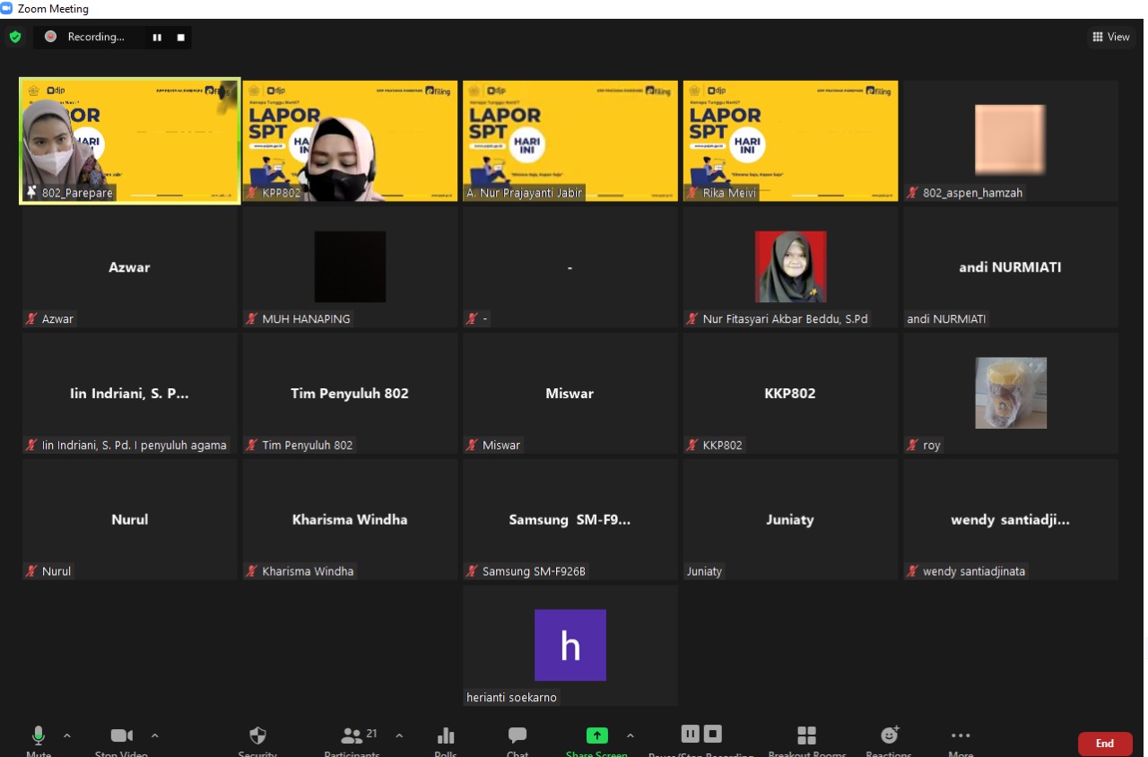 Kantor Pelayanan Pajak (KPP) Pratama Parepare menggelar Kelas Pajak Penyampaian SPT e-Filing Orang Pribadi secara daring melalui zoom meeting dari KPP Pratama Parepare (Selasa, 29/03). Kelas Pajak ini digelar sehubungan dengan sudah mendekati batas akhir penyampaian SPT Tahunan PPh Orang Pribadi yang jatuh pada 31 Maret 2022.