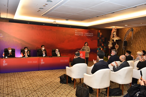 Rangkaian acara penandatanganan Deklarasi Bali ditutup dengan penyampaian kesimpulan dari Menteri Keuangan, Sri Mulyani dan Sekretaris Jenderal OECD, Mathias Cormann.