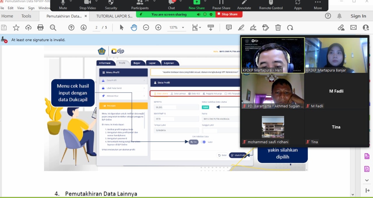 Dilanjutkan penyampaian materi oleh tim penyuluh KP2KP Martapura terkait implementasi penggunaan Nomor Induk Kependudukan (NIK) sebagai Nomor Pokok Wajib Pajak (NPWP) sesuai amanat UU HPP. Dijelaskan pula bahwa pemadanan NIK menjadi NPWP dapat dilakukan secara mandiri melalui laman pajak.go.id. Hal ini wajib dilakukan oleh WP paling lambat tanggal 31 Maret 2023 bersamaan dengan batas waktu pelaporan SPT Tahunan PPh OP.