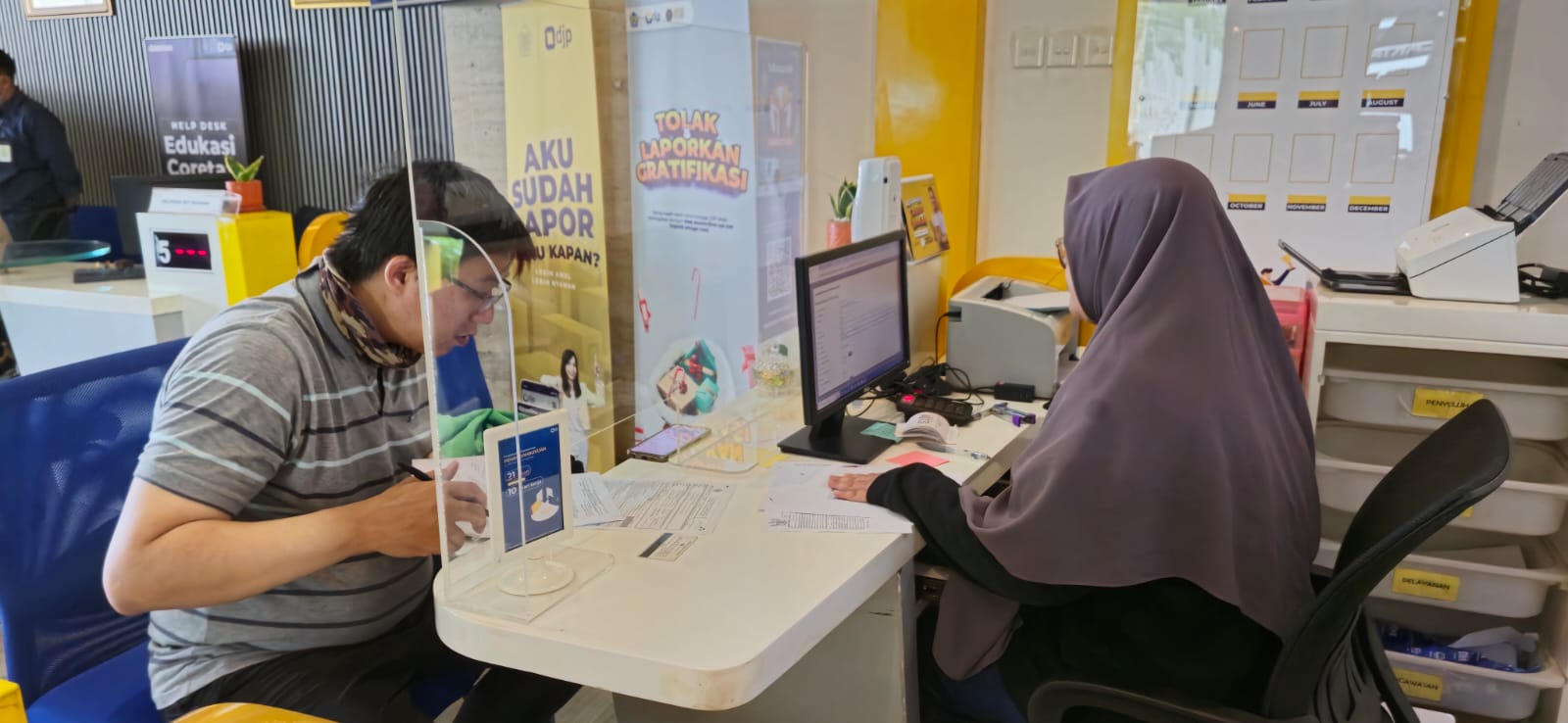 Petugas Tempat Pelayanan Terpadu (TPT) Kantor Pelayanan Pajak (KPP) Madya Tangerang Tara memberikan pelayanan kepada Wajib Pajak Orang Pribadi yang datang ke Loket TPT KPP Madya Tangerang, Jalan Jalur Sutera Barat Nomor 3, RT 003/RW 006, Pananggungan Timur, Pinang, Kota Tangerang, Banten (Kamis, 7/3).