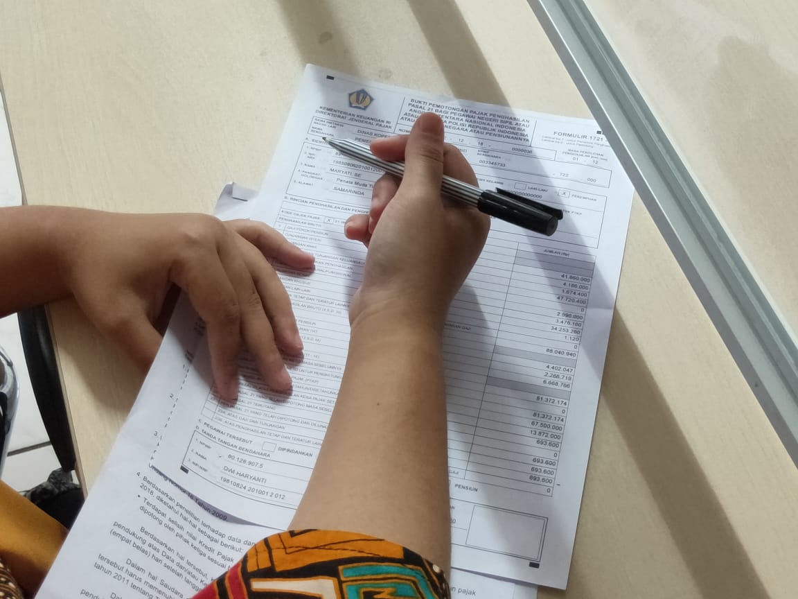 Erni Winardianti, Account Representative Kantor Pelayanan Pajak (KPP) Pratama Samarinda Ulu menyambut kedatangan wajib pajak yang mengunjungi KPP Pratama Samarinda Ulu di Kota Samarinda (Selasa, 12/10). Wajib pajak tersebut datang dengan membawa selembar bukti potong Pajak Penghasilan (PPh) Pasal 21 untuk mendapat asistensi pelaporan Surat Pemberitahuan (SPT) Tahunan.