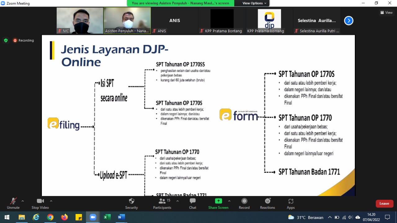 Kantor Pelayanan Pajak (KPP) Pratama Bontang menyelenggarakan kegiatan Kelas Pajak secara daring terkait tata cara pengisian Surat Pemberitahuan (SPT) Tahunan Badan melalui aplikasi e-Form di Kota Bontang (Rabu, 23/03). Dengan diikuti oleh wakil beberapa Wajib Pajak badan diwilayah kerja KPP Pratama Bontang, kegiatan dimulai pada pukul 14.00 WITA sampai dengan 15.30 WITA.